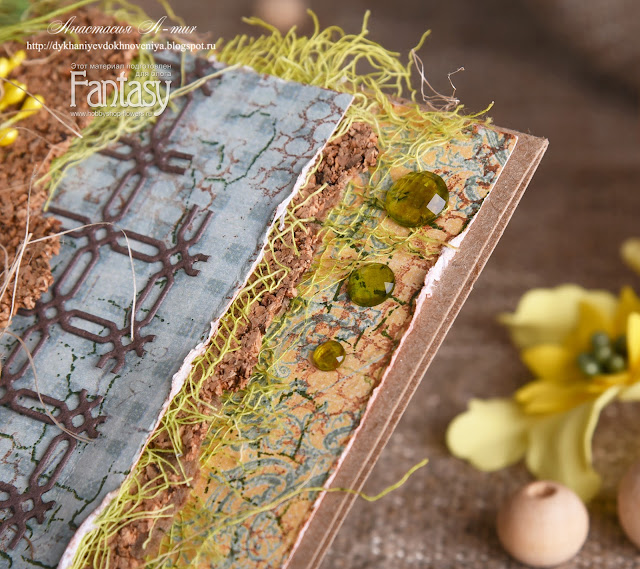 Для декора использовала фантазийный цветок ручной работы из ревелюра (мой МК по созданию таких цветов вы можете найти здесь); вырубку; декоративные колоски, ягодки, грушу и грибочек; перья; тычинки; сизаль; бечевку; металлические подвески и несколько граненых камушков.
