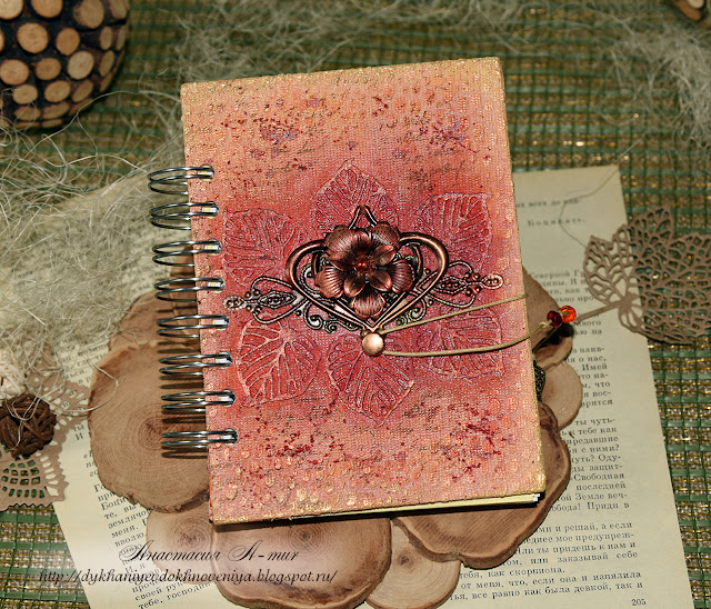 Обложку обтянула тканью, загрунтовала, нанесла текстурную пасту через трафарет, приклеила вырубные листочки. Затем окрасила её спреями и акриловыми красками, прошлась фоновым штампом "рукописный текст", добавила немного брызг. По краям обложки сделала эмбоссинг пудрой светлое золото. Для декора использовала металлические украшения, которые окрасила алкогольными чернилами. Блокнот застегивается на вощеный шнур, украшенный стеклянными бусинками и подвесочкой-листиком. Формат блокнота А6.